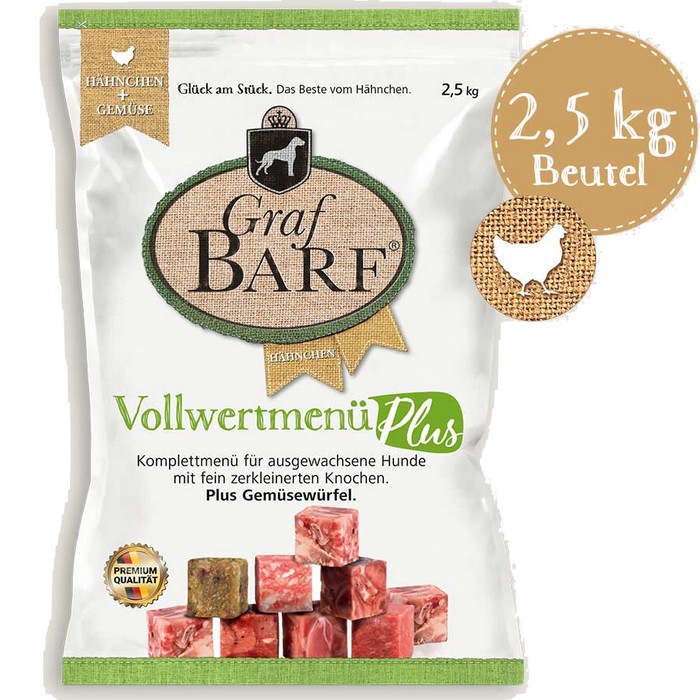 7 rozdílných syrových Graf Barf kostek (2,5 x 2,5 cm) vytváří různorodé, vyvážené a zdravé menu. Všechny suroviny jsou čistě kuřecí, v přírodním stavu a v potravinářské kvalitě. V porovnání s klasickým plnohodnotným menu obsahuje najemno krájené kuřecí krky a je proto určen pro zbrklé psy a nebo psy kteří mají problémy s chrupem, tak zajišťuje bezpečí během krmení.