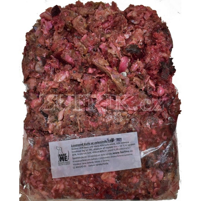 Složení: losos celý mletý 45%. kuře celé mleté 45%. zelenina - mrkev. řepa 10%